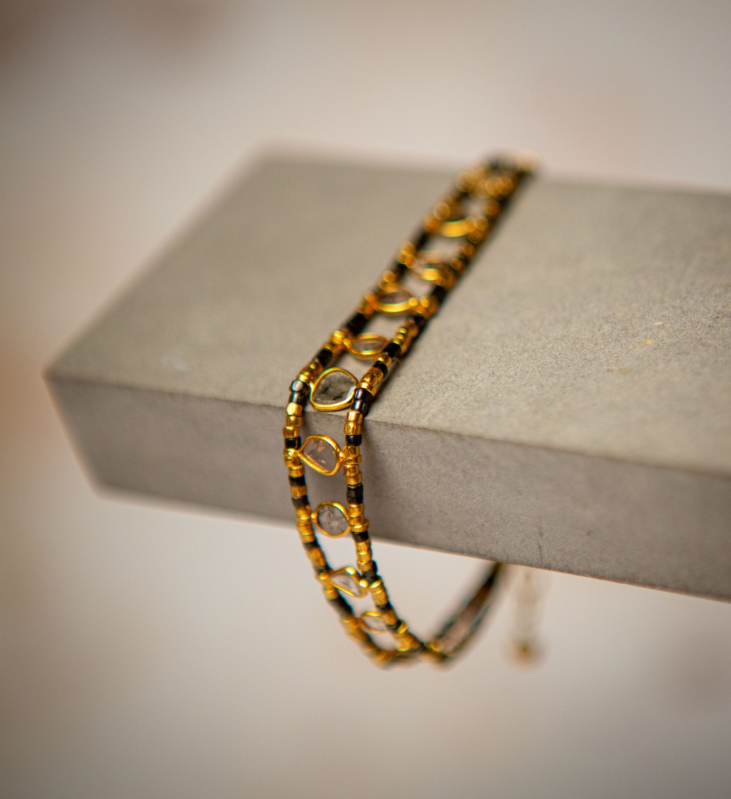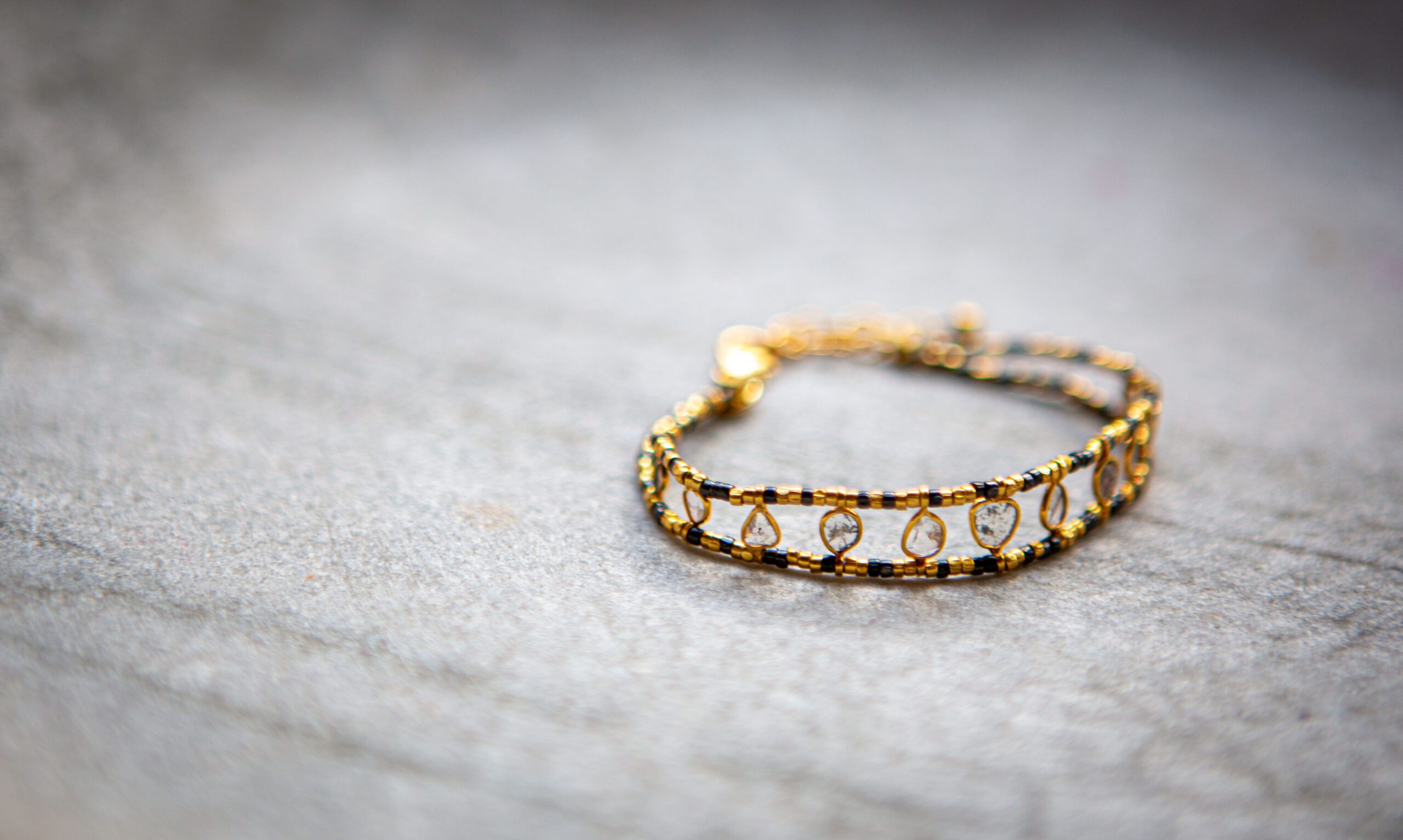 Delicate, beautiful gold vermeil bracelet featuring uncut diamond slices with gorgeous natural inclusions and textures. A relatively new trend in jewellery design, the stunning bracelet is for the fashion-forward woman, who see the beauty in these unique gemstones.