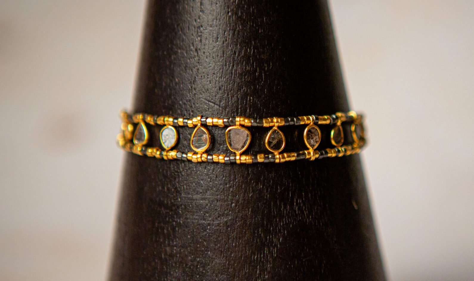 Gemstone: uncut diamond slices; each bracelet features 11 bezel set diamond slices