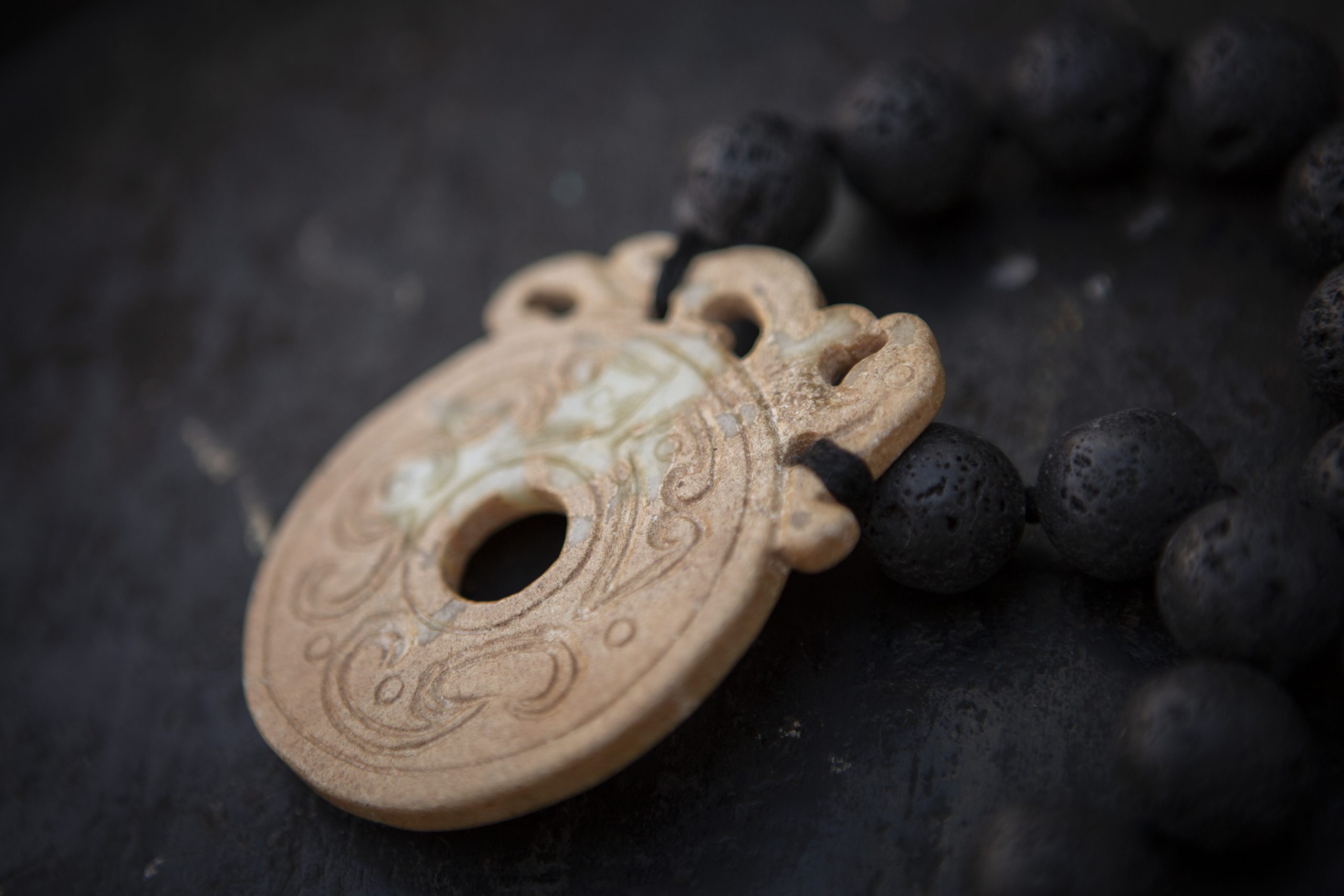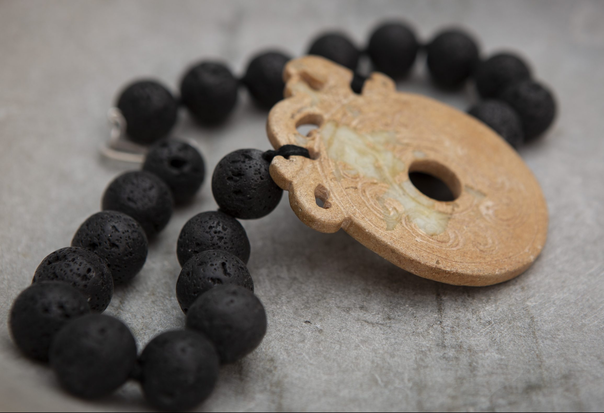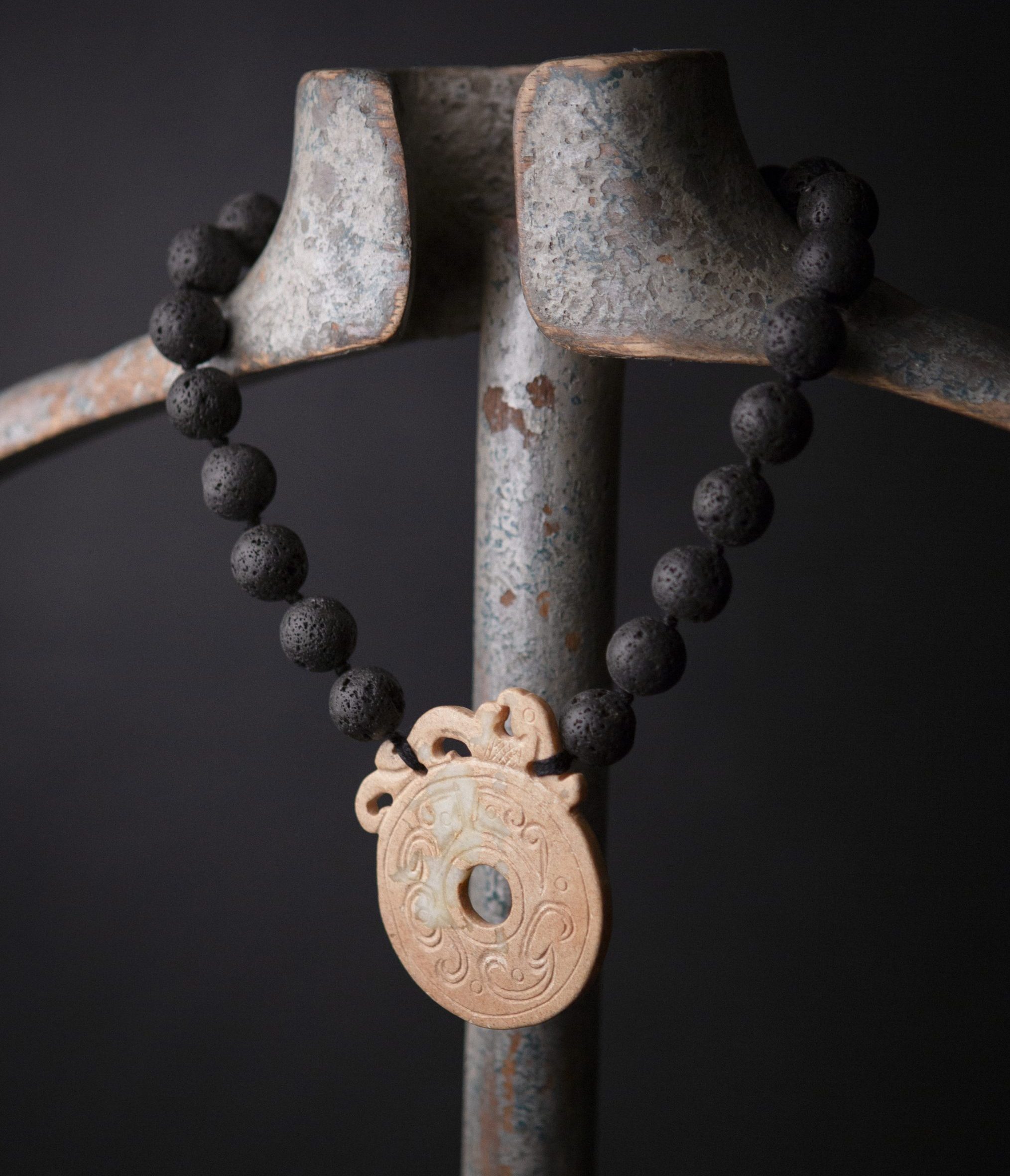 Made with natural black lava, our lava bead necklace features chunky beads and a beautiful Chinese vintage jade pendant.