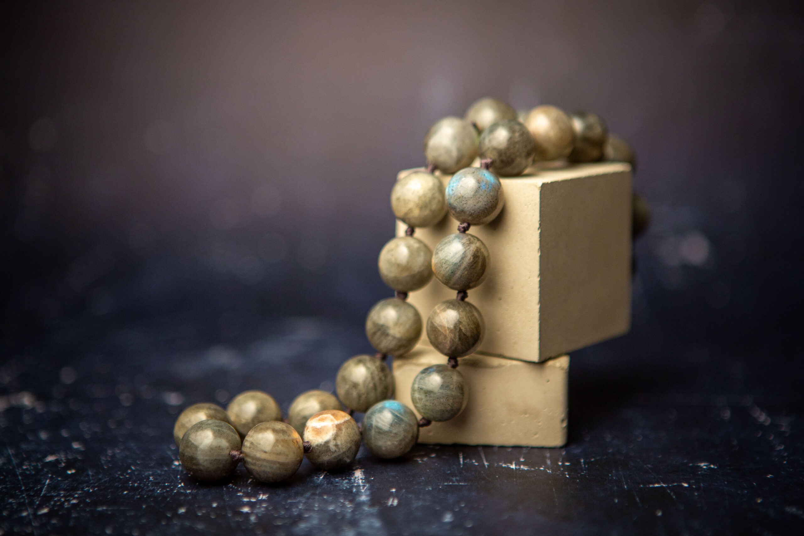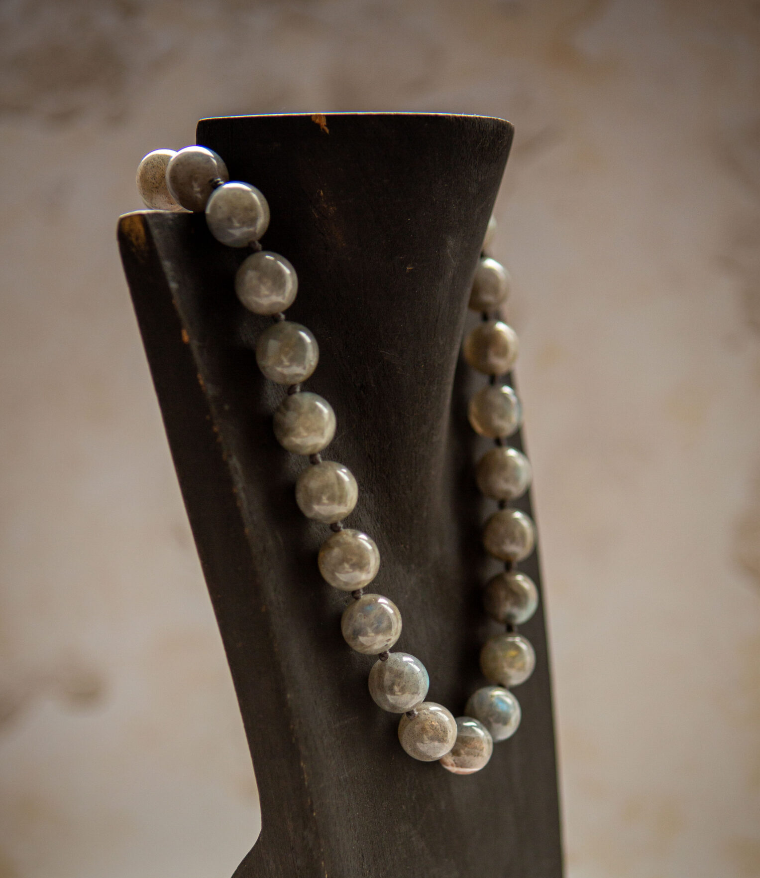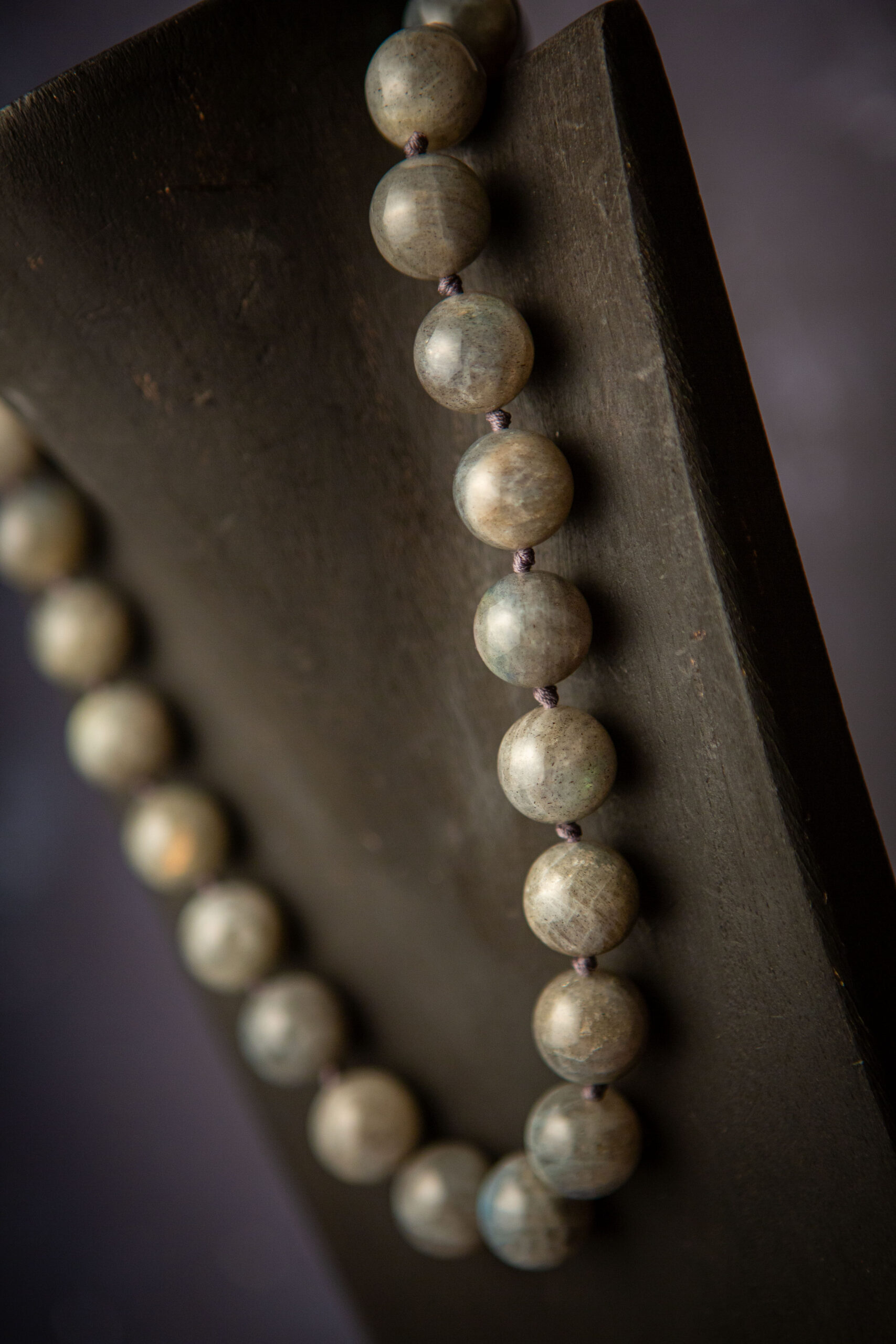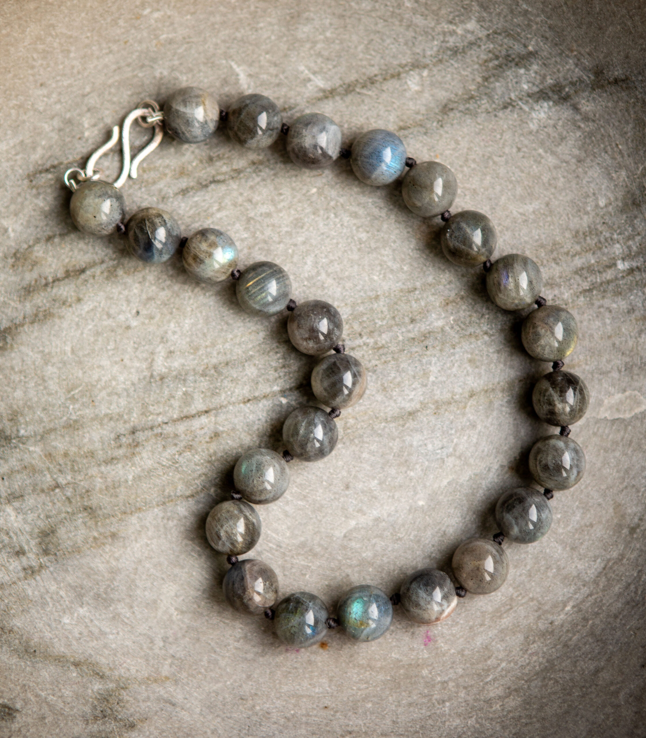 Gorgeous beads of polished labradorite are hand-knotted into a lovely, tactile necklace. The labradorite stones are complimented by a contemporary silver clasp.