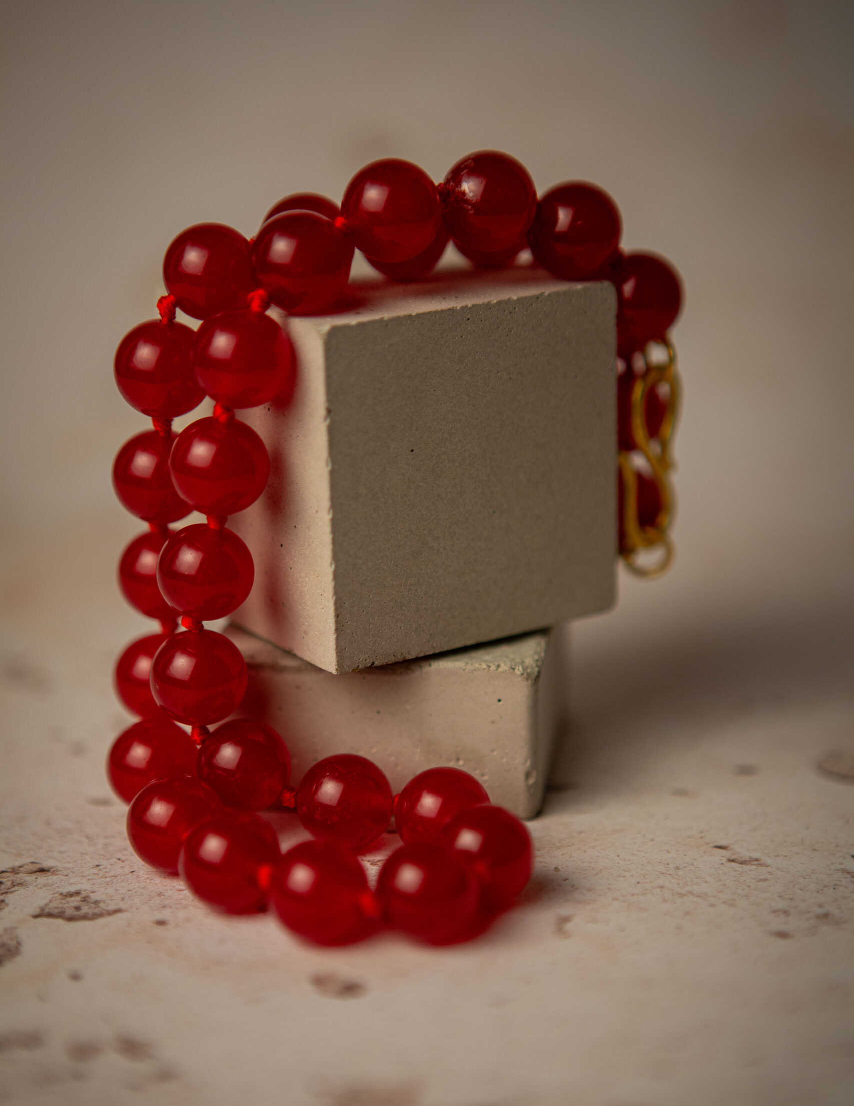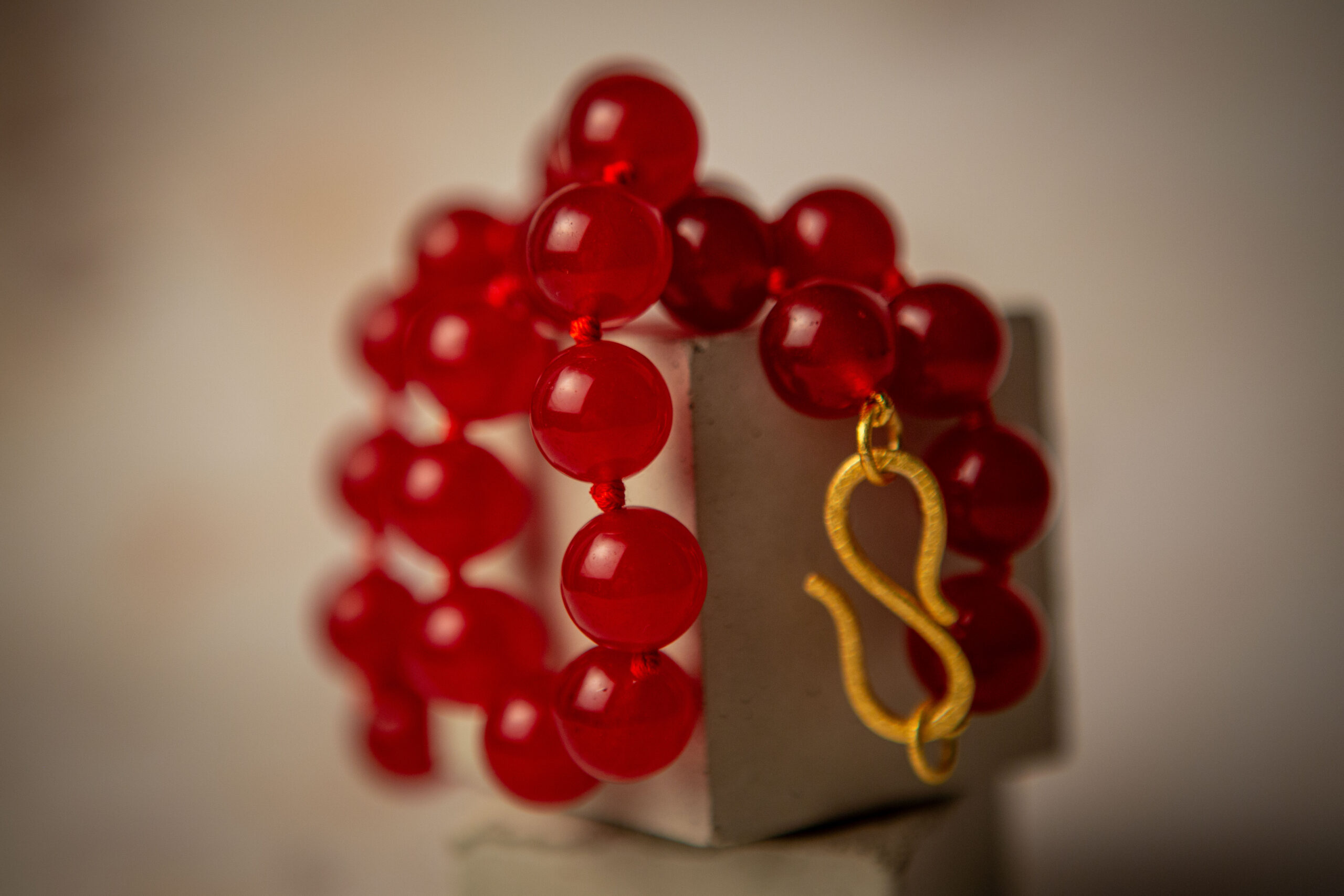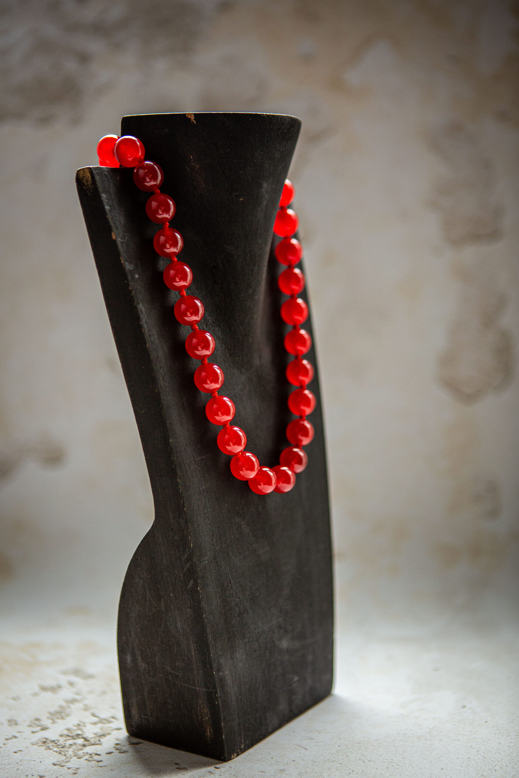 Gorgeous beads of polished red jade are hand-knotted into a lovely, tactile necklace. The red jade stones are complimented by a contemporary gold-plated silver clasp.
