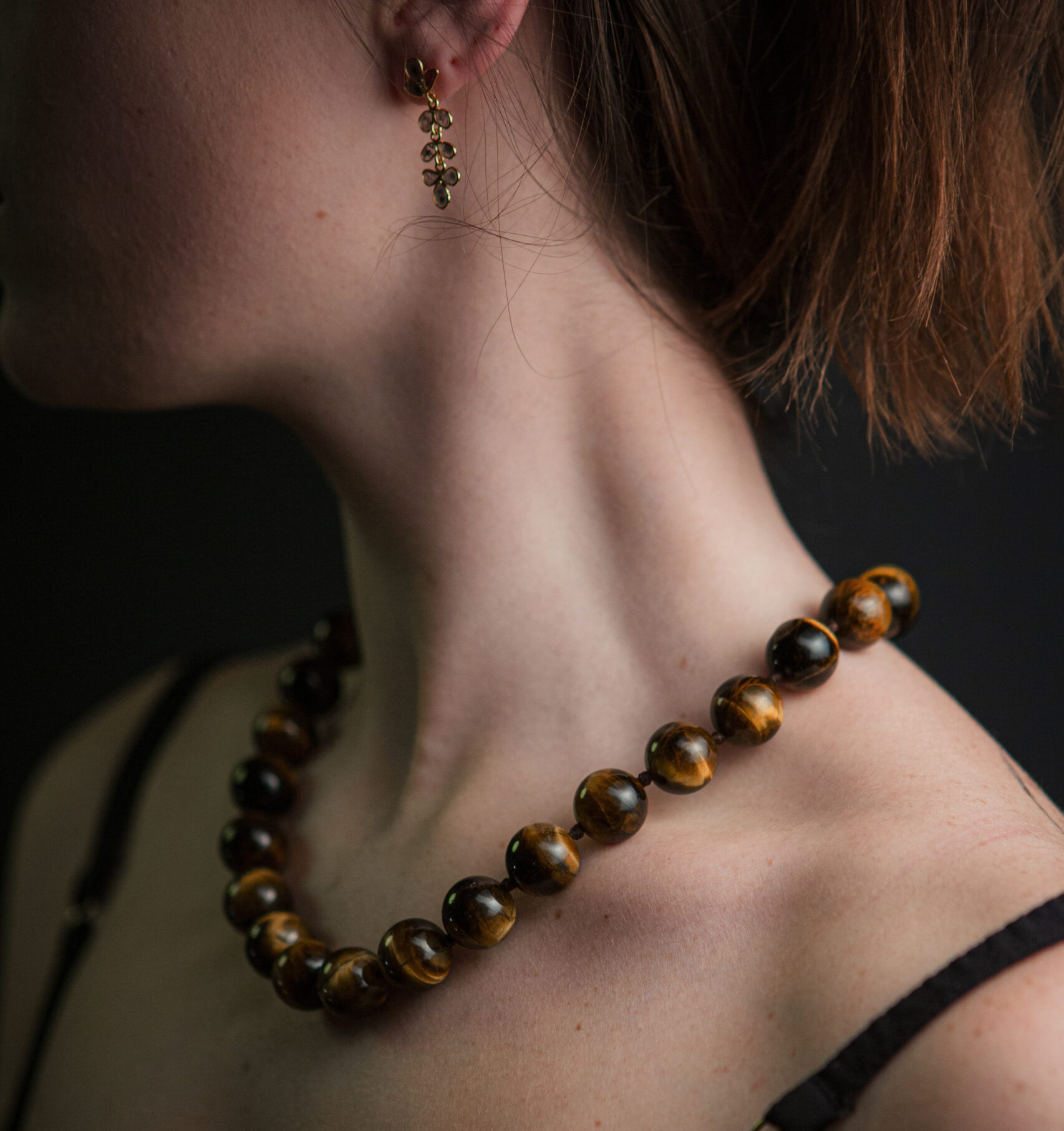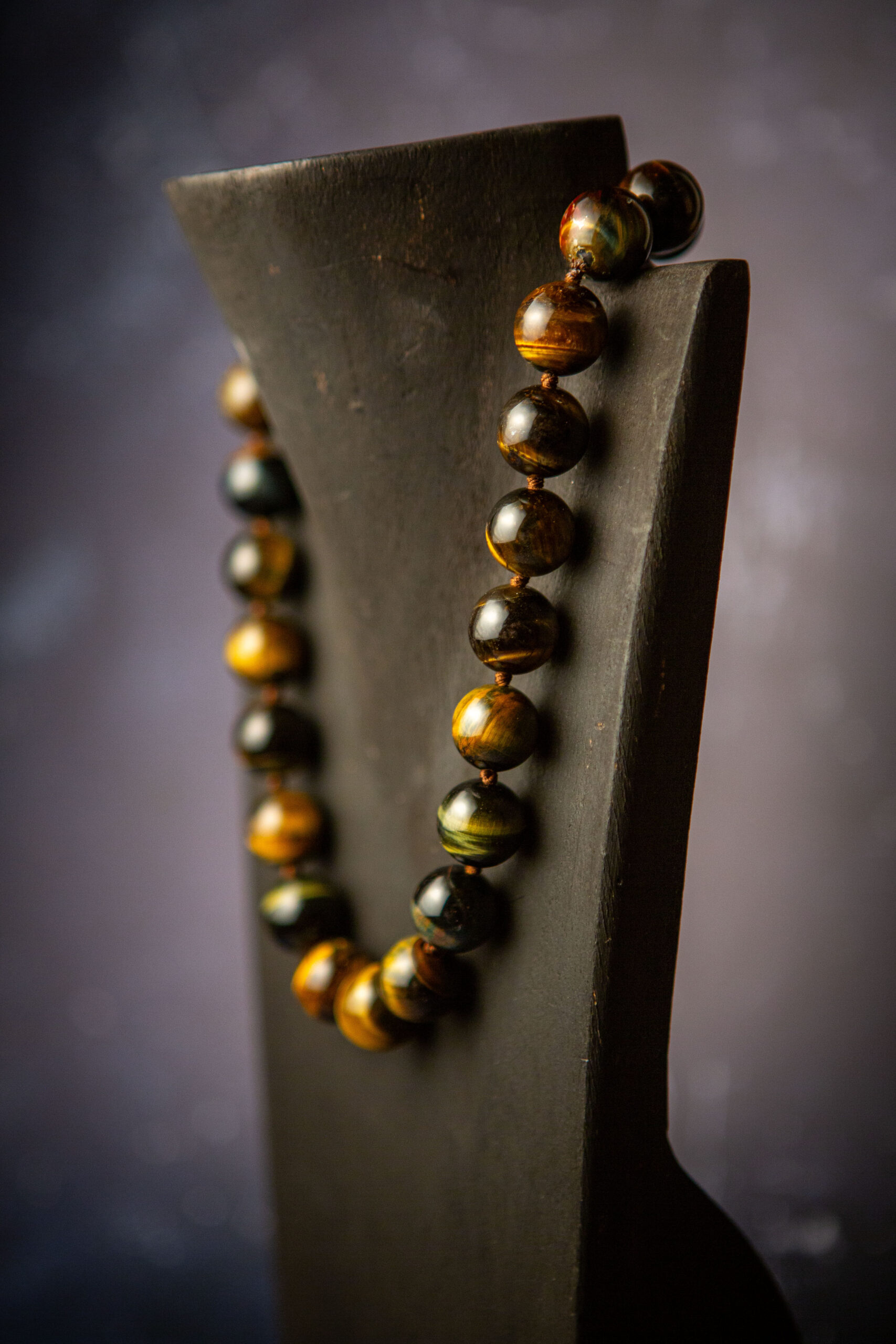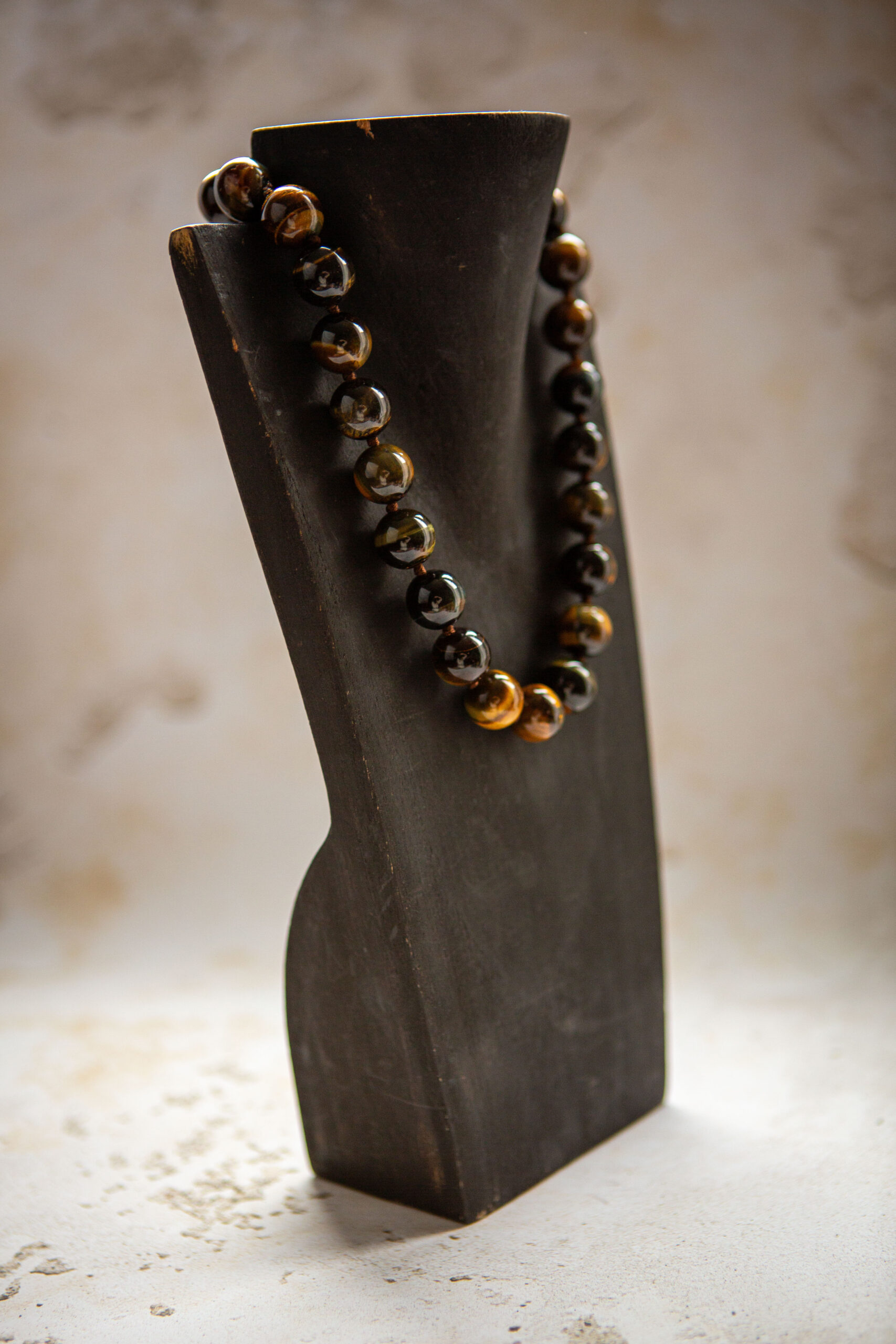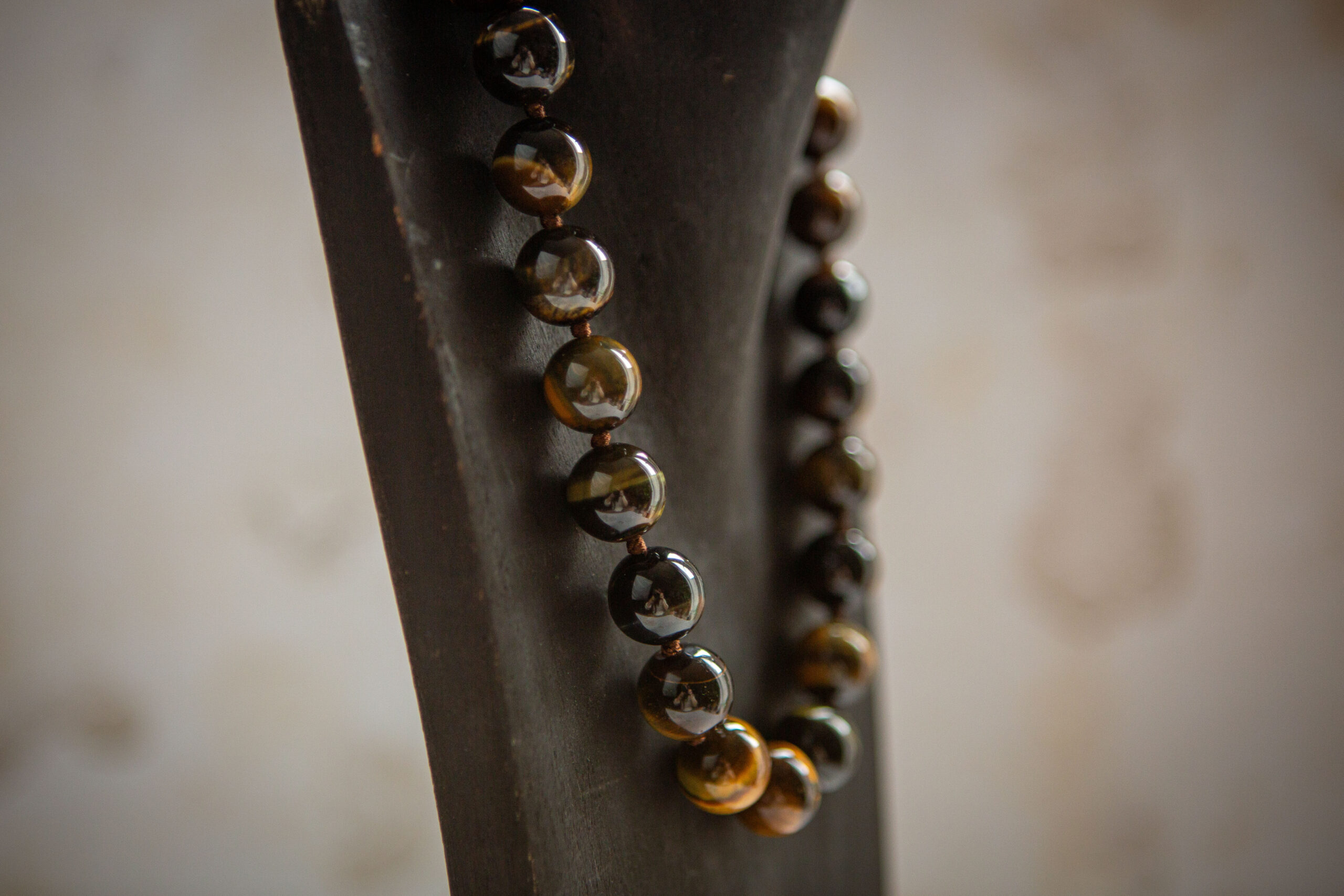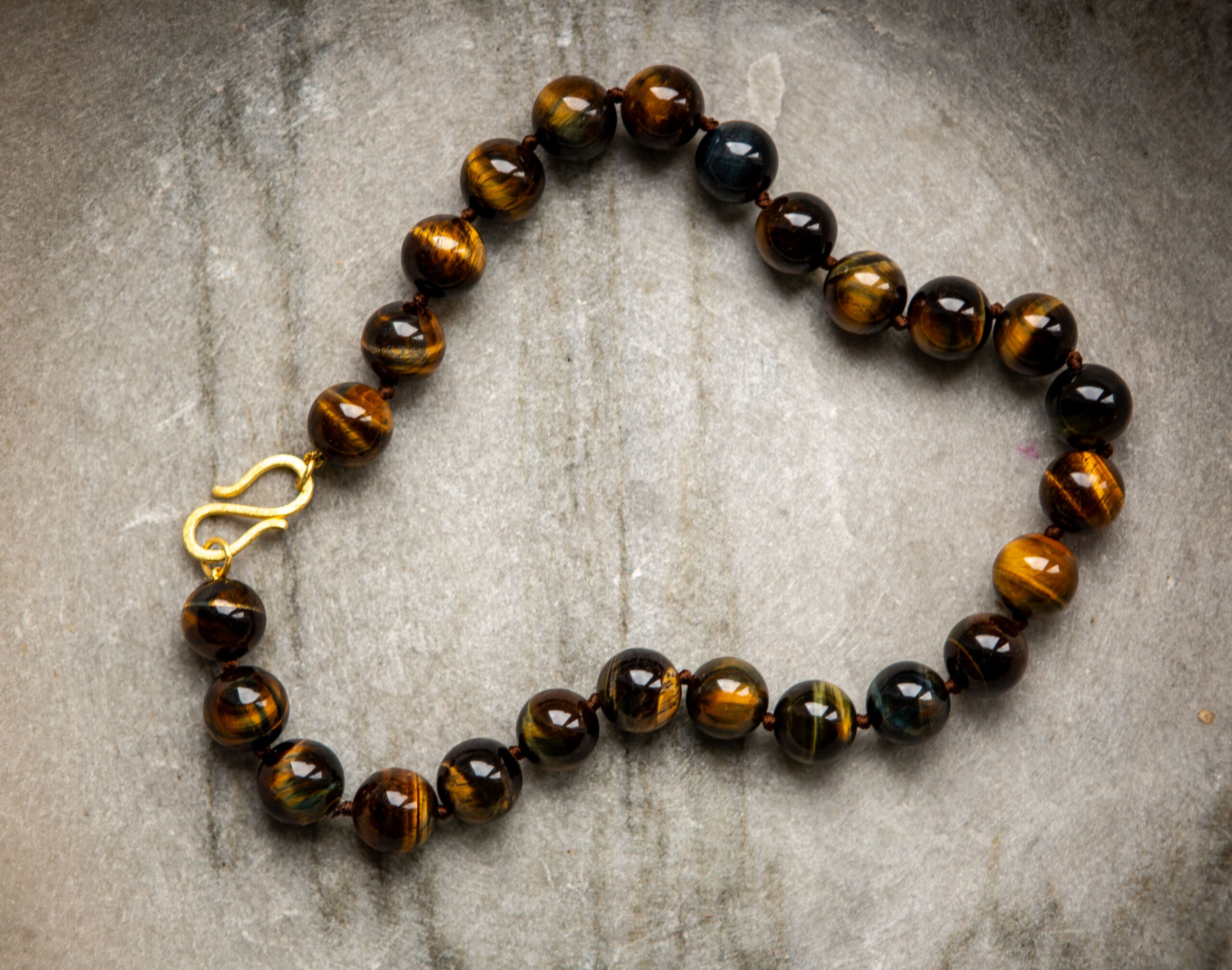 Gorgeous beads of polished tigers are hand-knotted into a striking, tactile necklace. The tigers eye stones are complimented by a contemporary gold-plated silver clasp.
